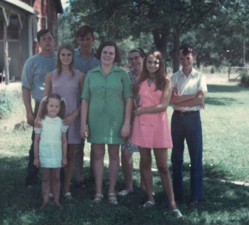 Summer 1969: Top left to right are Fred, Rick, Mom, and Dave. Bottom left to right are tiny me, Jo Ann, Lisa, and Cappa. No Pop in the photo because he’s the one with the polaroid.
