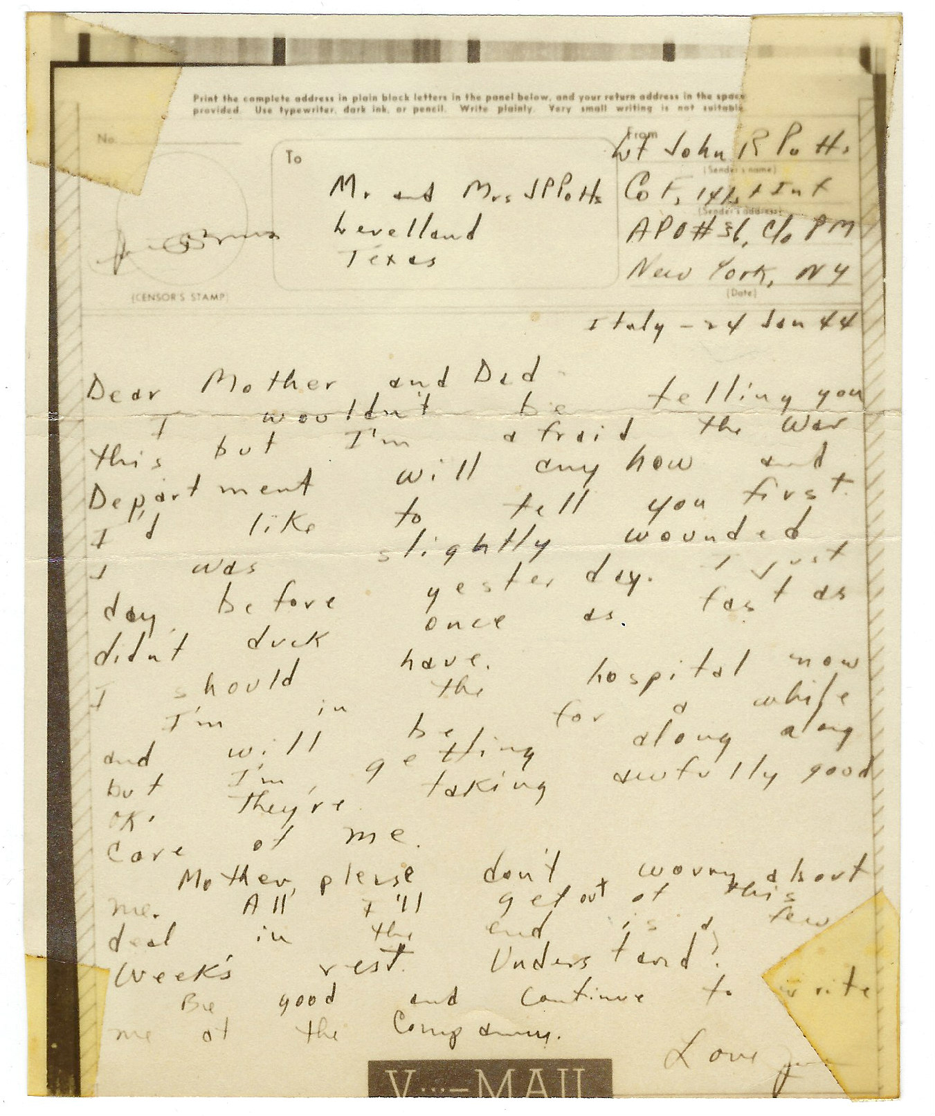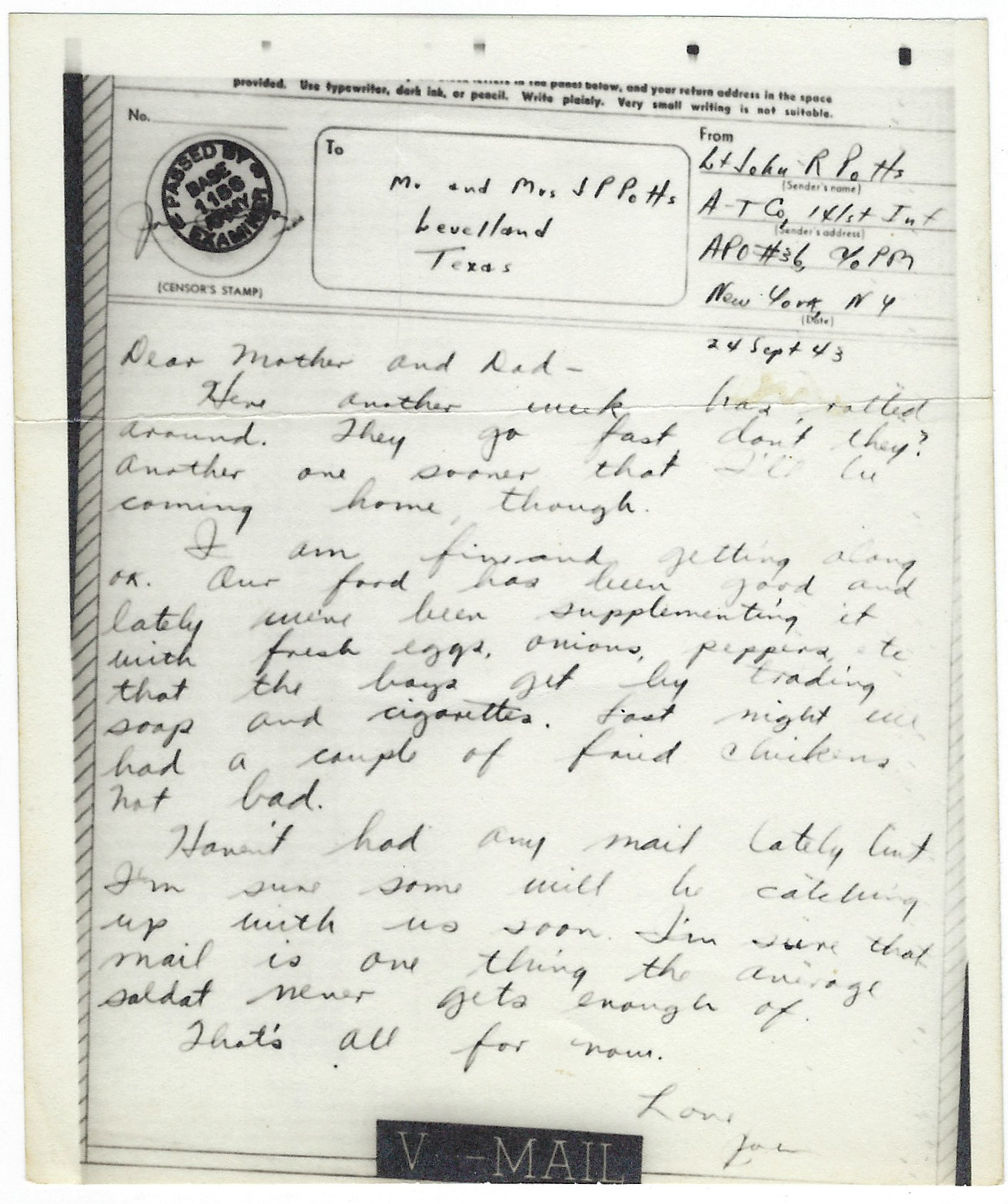 - V-Mail to Ma & Pa Potts, 24 Sep 1943 (Italy)