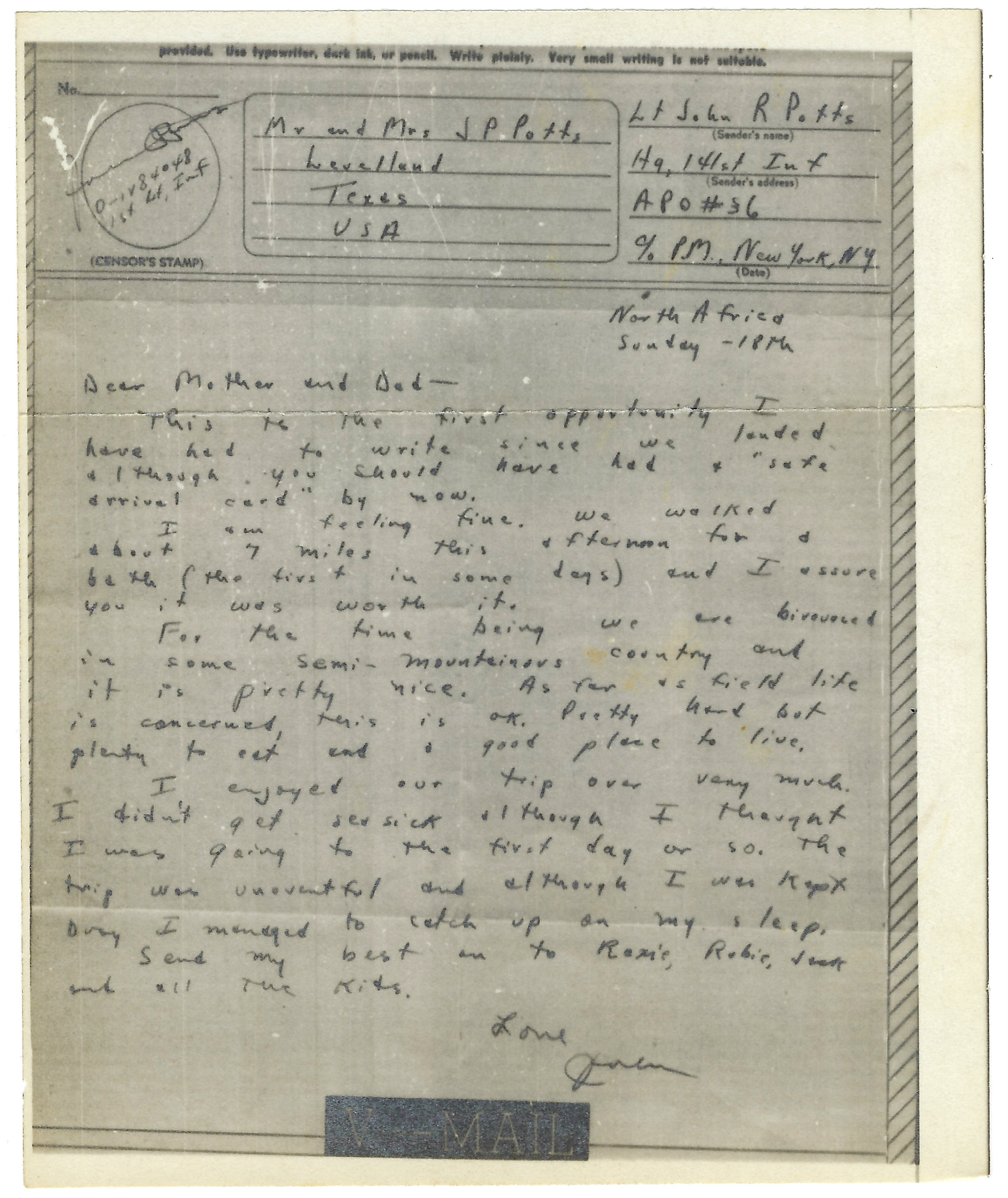 - V-Mail to Ma & Pa Potts, 18 April 1943 (North Africa)
