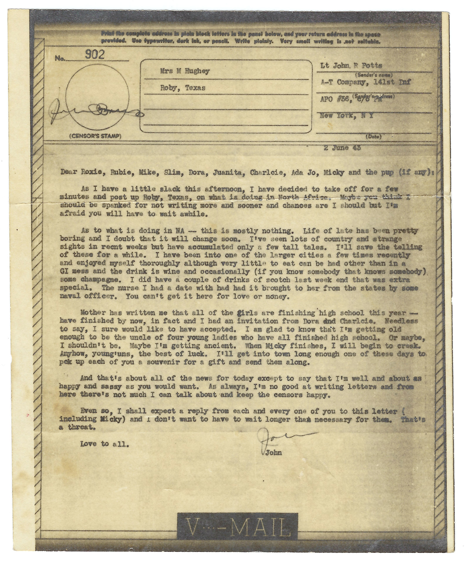 - V-Mail to Aunt Roxie, 2 June 1943 (North Africa)