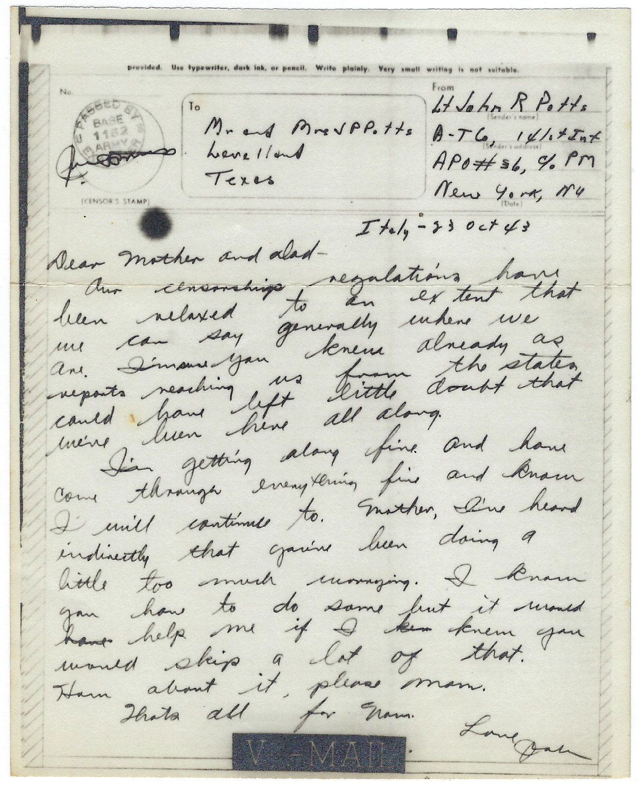- V-Mail to Ma & Pa Potts, 23 Oct 1943 (Italy)